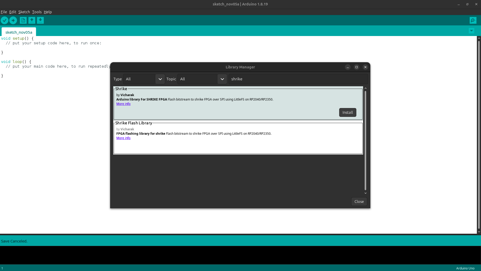 The Arduino library developed by Vicharak takes care of configuring the FPGA for you. You can install it directly from the Arduino IDE’s Library Manager, just search for “Shrike” and install the Shrike library.